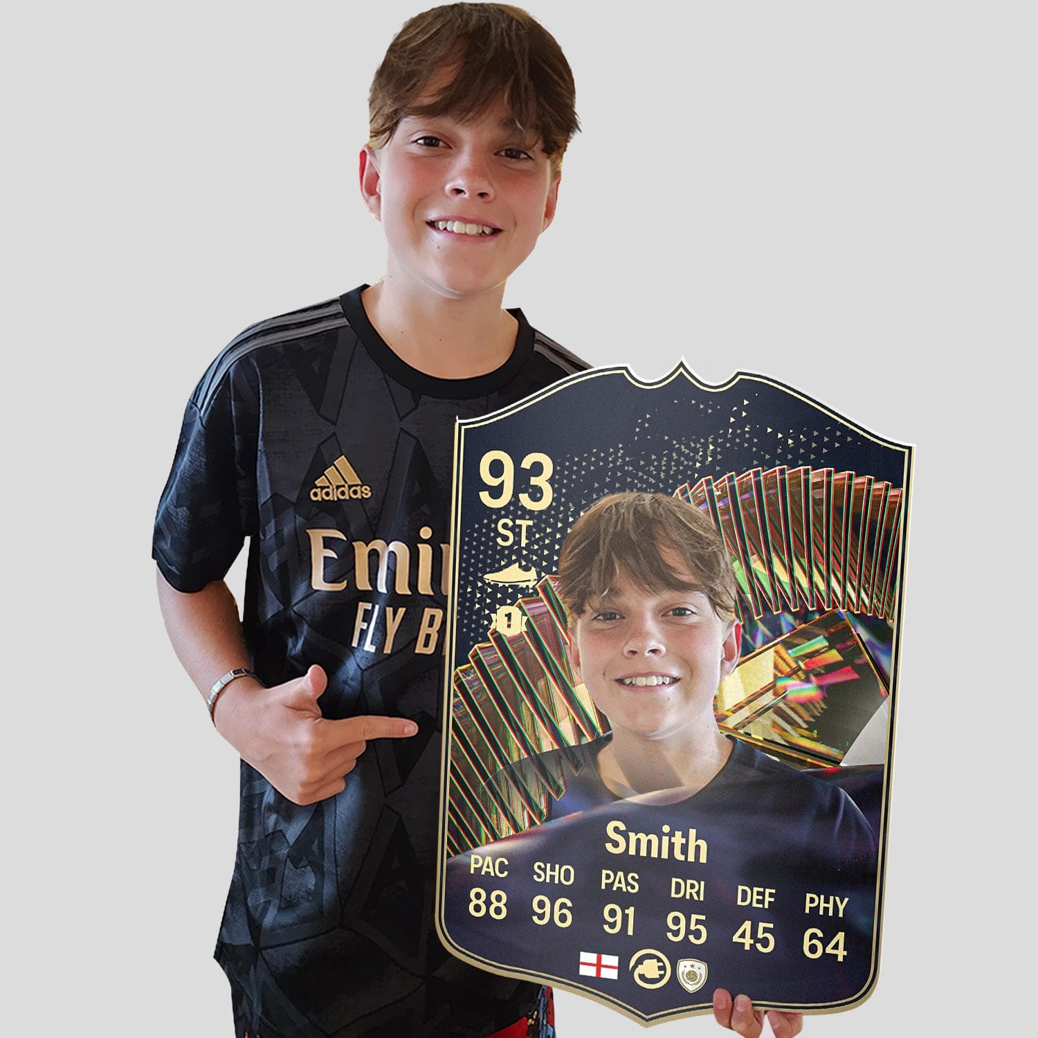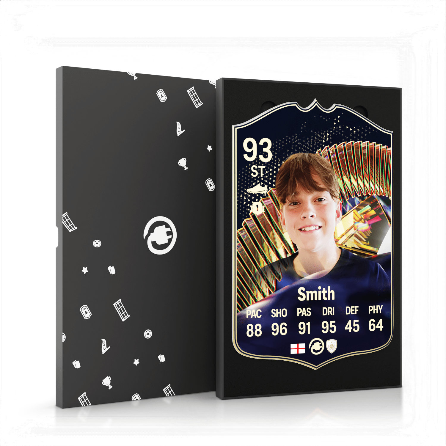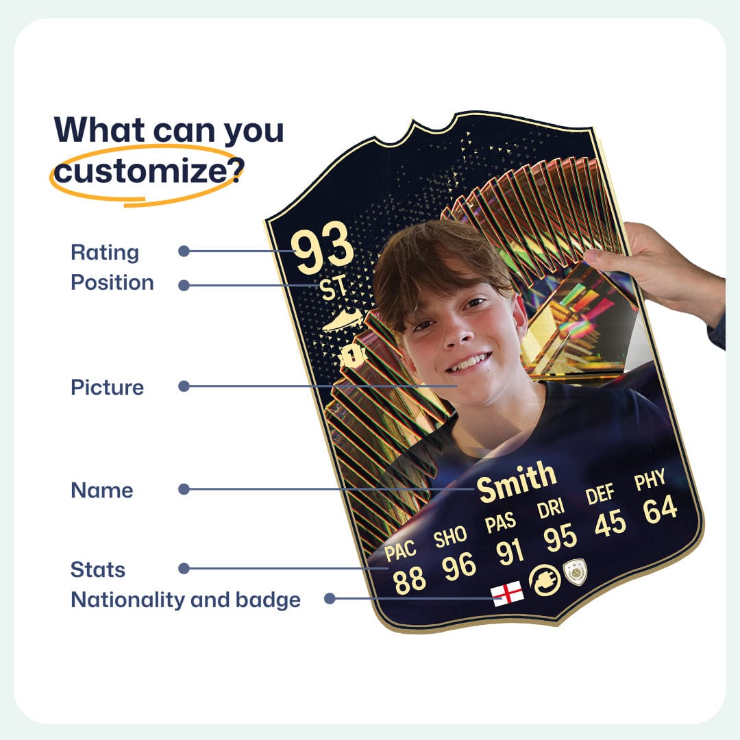 When it comes to personalising your card, the basic steps are to upload a photo and add a name to your card. Then you’ll add details like your player’s position and skill ratings out of 99 for each football skill shown on the card. Our online card builder makes this really easy. And if you aren’t a football card expert, don’t worry!