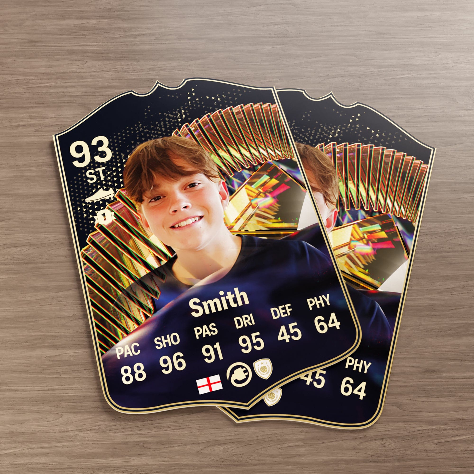 Our football card builder lets you choose between two different card materials. Our Standard cards are made of a ultra-strong variety of Foamex (not cardboard or foam!). This material has a lovely gloss finish and is also super durable. Our world-exclusive Metal football cards have a matte finish and are slightly heavier. Both look amazing and will last forever.