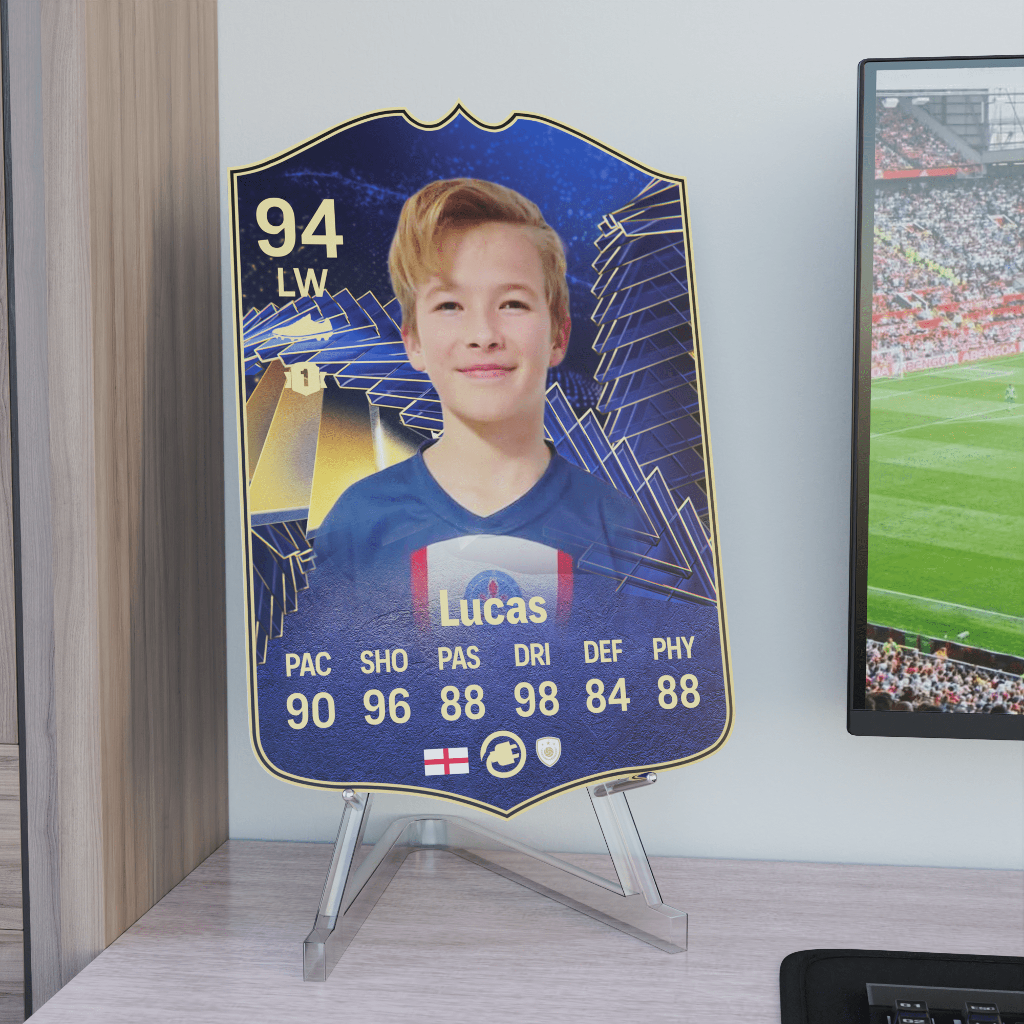 When it comes to personalising your card, the basic steps are to upload a photo and add a name to your card. Then you’ll add details like your player’s position and skill ratings out of 99 for each football skill shown on the card. Our online card builder makes this really easy. And if you aren’t a football card expert, don’t worry!