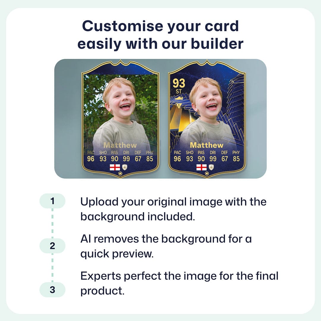 Yes! Our football card designers will remove the background from the photo you upload so it looks just like the football cards you might’ve seen games like EA FC 25, EA FC 24 or FIFA. We’ll also position the photo perfectly on the football card so it looks great. If there are any problems with the quality of your photo, we’ll reach out and let you know. Plus, our website's AI will remove the background on the image for visual purposes before purchase so you can see it without a background on the card.