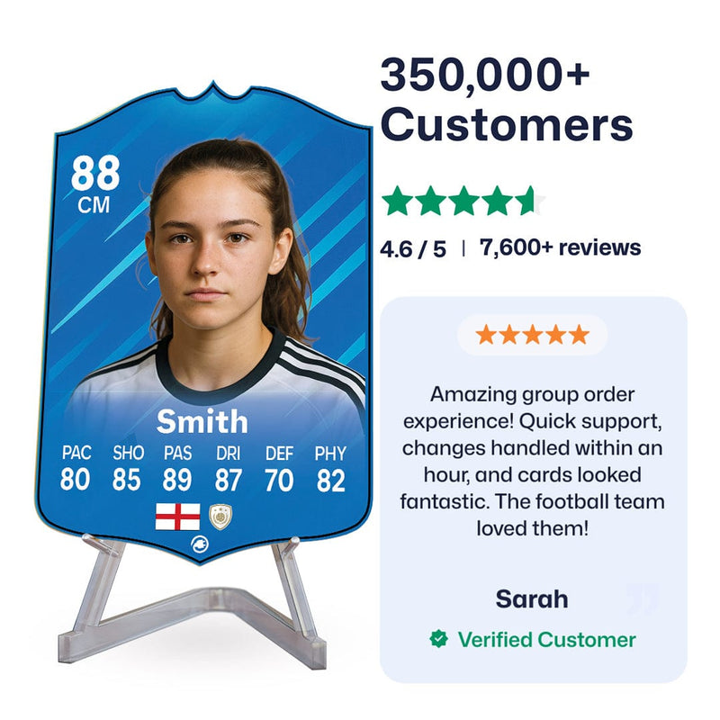 Once you’ve personalised your card, our design experts will edit your photo, design your card, and bring it to life in stunning quality. You’ll get a full preview before we print your card and every card’s quality is backed by our Gold Standard Guarantee. So far, over 350,000+ football fans agree: A CardsPlug football card is the ultimate football gift!