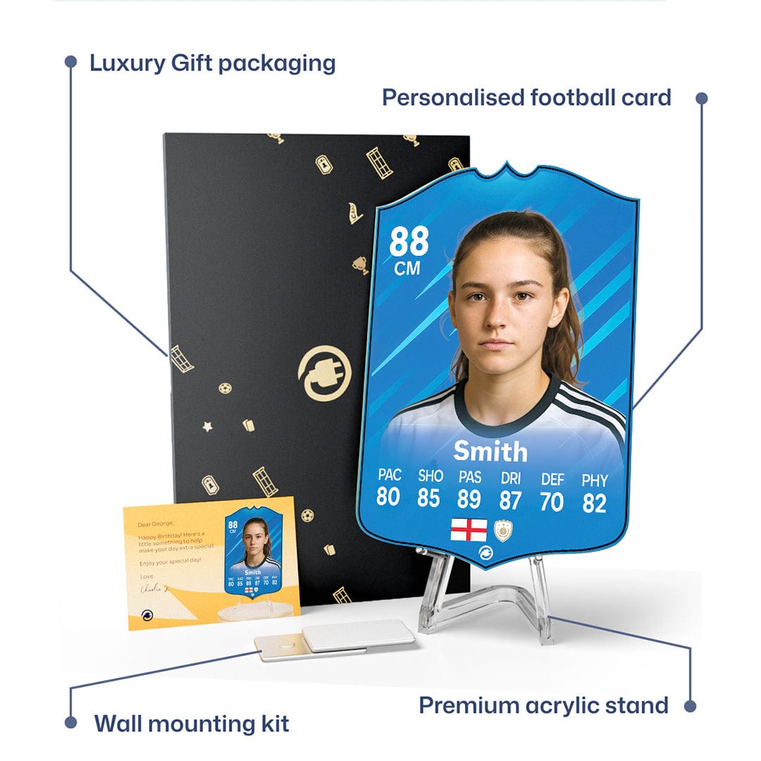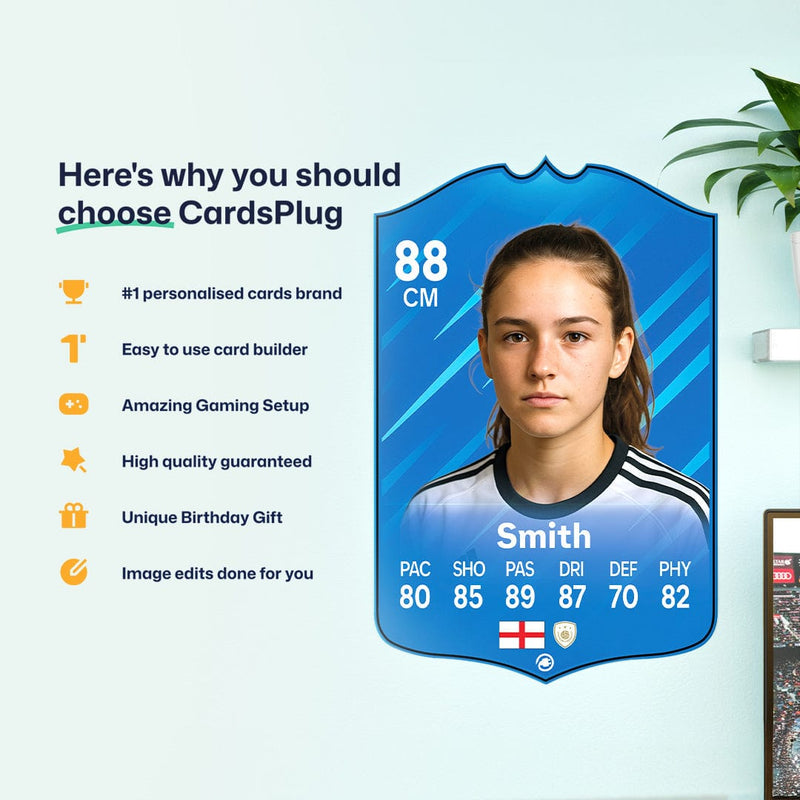 CardsPlug is home to the world’s favourite personalised football cards. Our easy football card builder lets you make a real life football card with your own name, photo, and skill ratings. With 100+ designs to choose from and some inspired by EA SPORTS FC 26 cards seen in EA FC 26, EA FC 25 and FC 24 as well as FIFA cards seen in games like FIFA 23 and FIFA 22.