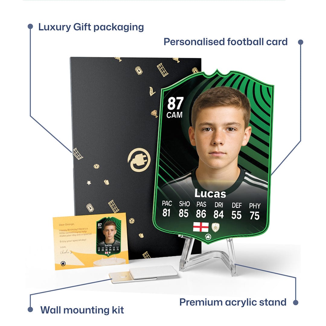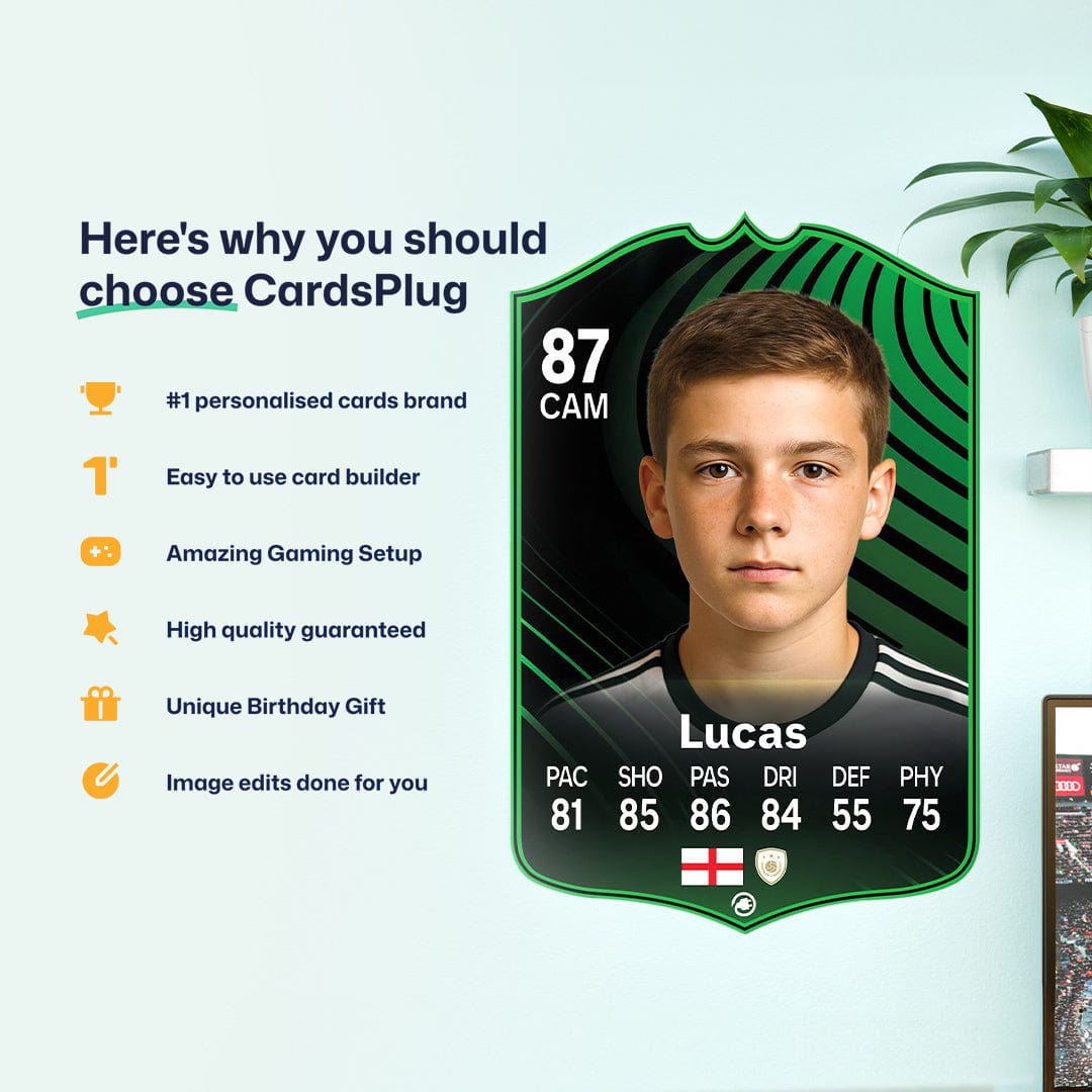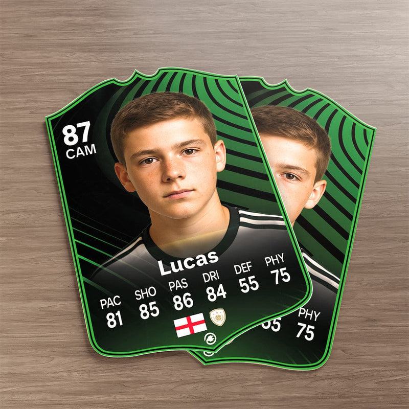 CardsPlug is home to the world’s favourite personalised football cards. Our easy football card builder lets you make a real life football card with your own name, photo, and skill ratings. With 100+ designs to choose from and some inspired by EA SPORTS FC 26 cards seen in EA FC 26, EA FC 25 and FC 24 as well as FIFA cards seen in games like FIFA 23 and FIFA 22.