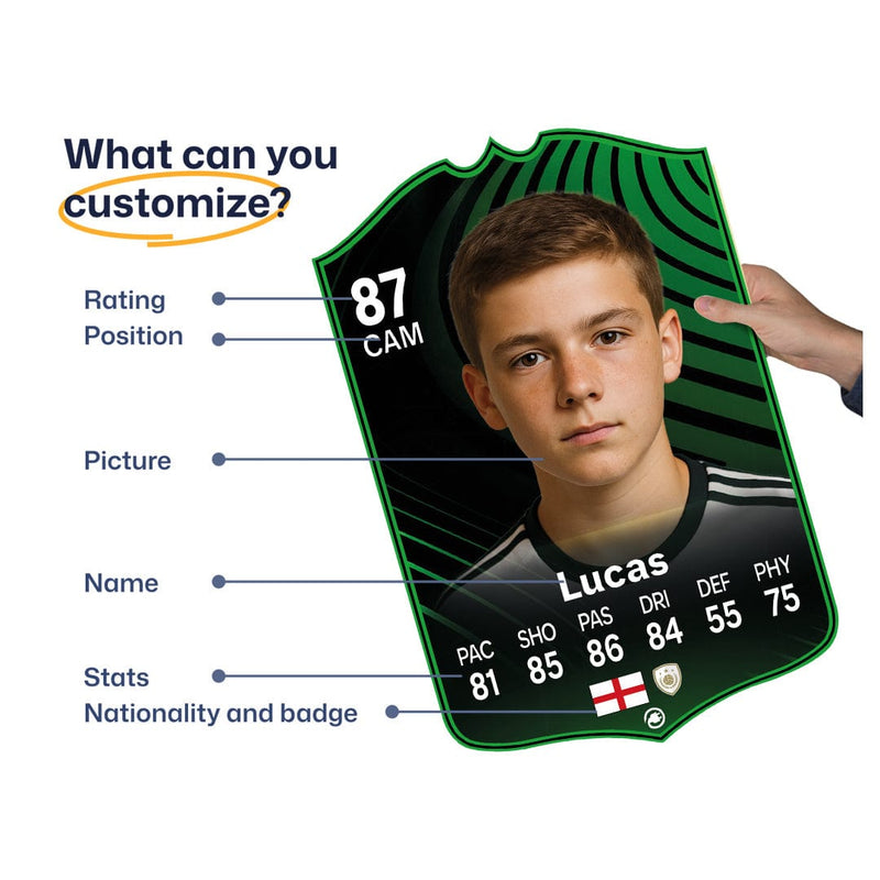 When it comes to personalising your card, the basic steps are to upload a photo and add a name to your card. Then you’ll add details like your player’s position and skill ratings out of 99 for each football skill shown on the card. Our online card builder makes this really easy. And if you aren’t a football card expert, don’t worry!