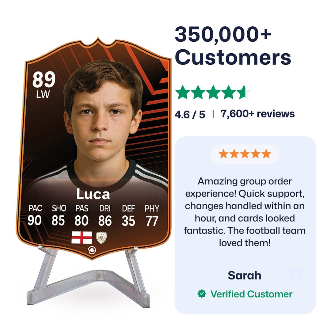 Yes! Our football card designers will remove the background from the photo you upload so it looks just like the football cards you might’ve seen games like EA FC 25, EA FC 24 or FIFA. We’ll also position the photo perfectly on the football card so it looks great. If there are any problems with the quality of your photo, we’ll reach out and let you know. Plus, our website's AI will remove the background on the image for visual purposes before purchase so you can see it without a background on the card.