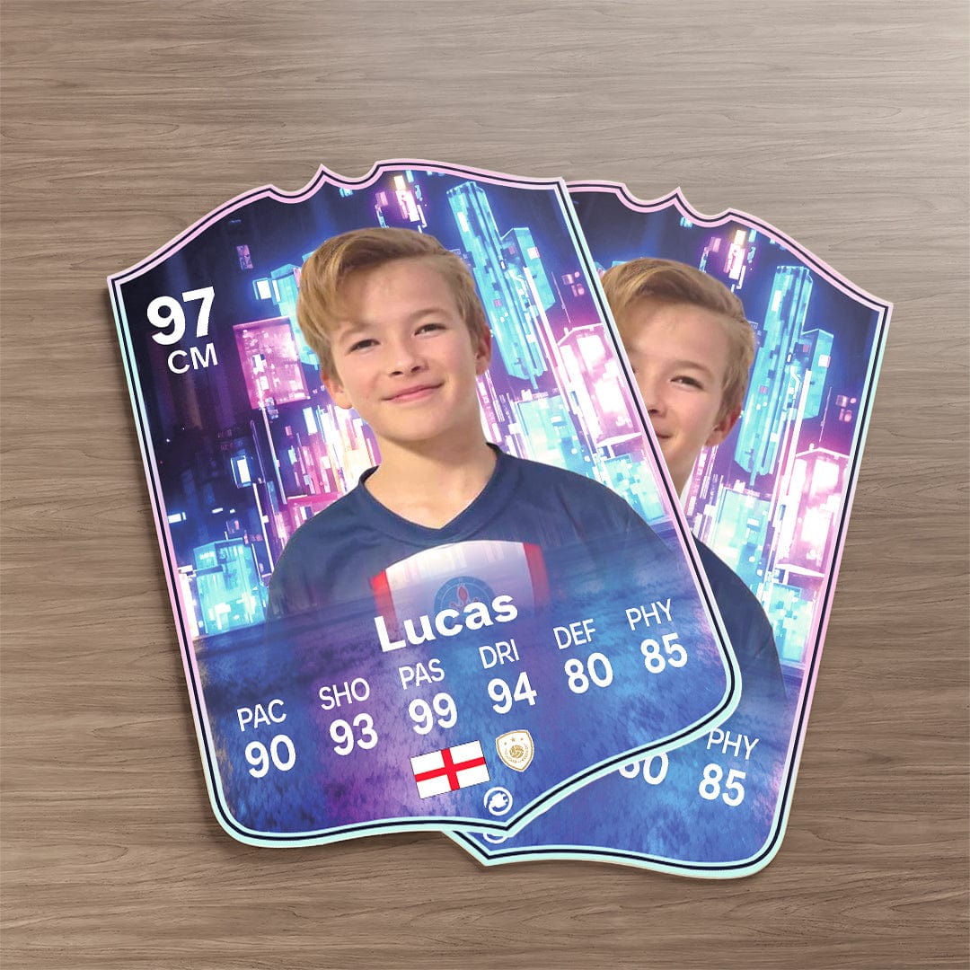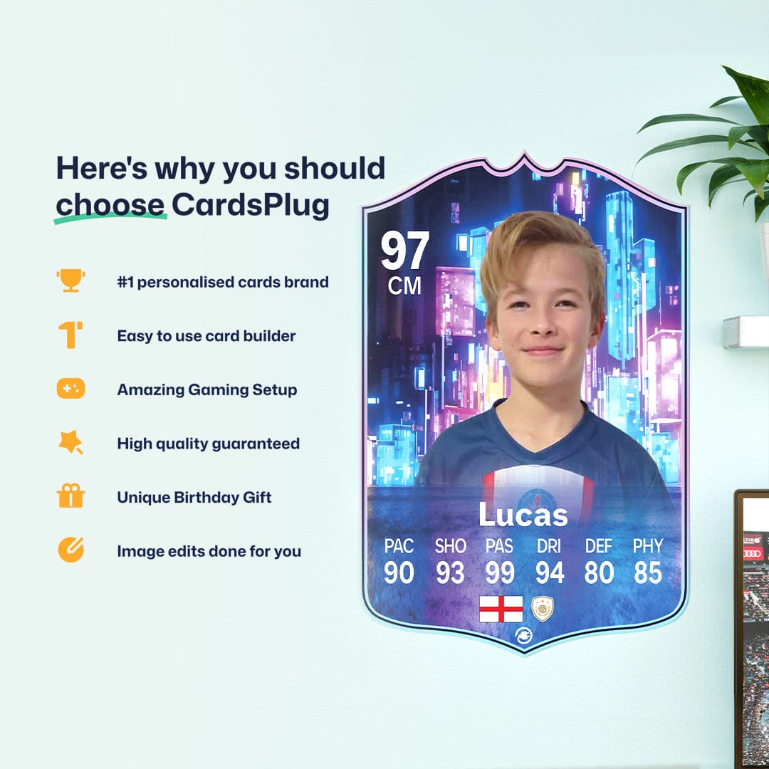 CardsPlug is home to the world’s favourite personalised football cards. Our easy football card builder lets you make a real life football card with your own name, photo, and skill ratings. With 100+ designs to choose from and some inspired by EA SPORTS FC 26 cards seen in EA FC 26, EA FC 25 and FC 24 as well as FIFA cards seen in games like FIFA 23 and FIFA 22.