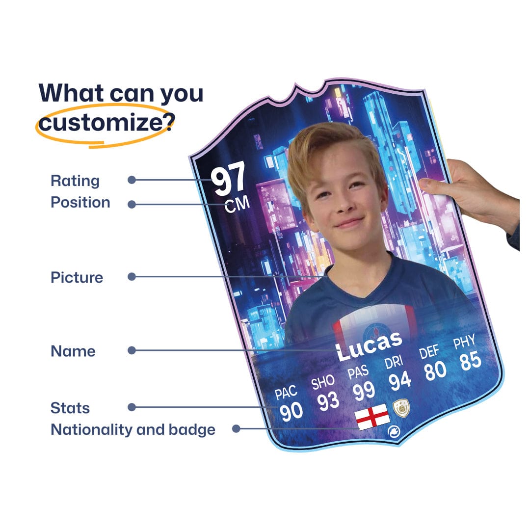 When it comes to personalising your card, the basic steps are to upload a photo and add a name to your card. Then you’ll add details like your player’s position and skill ratings out of 99 for each football skill shown on the card. Our online card builder makes this really easy. And if you aren’t a football card expert, don’t worry!