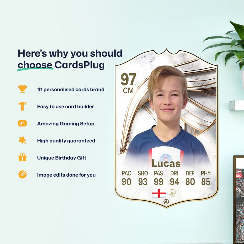 When it comes to personalising your card, the basic steps are to upload a photo and add a name to your card. Then you’ll add details like your player’s position and skill ratings out of 99 for each football skill shown on the card. Our online card builder makes this really easy. And if you aren’t a football card expert, don’t worry!