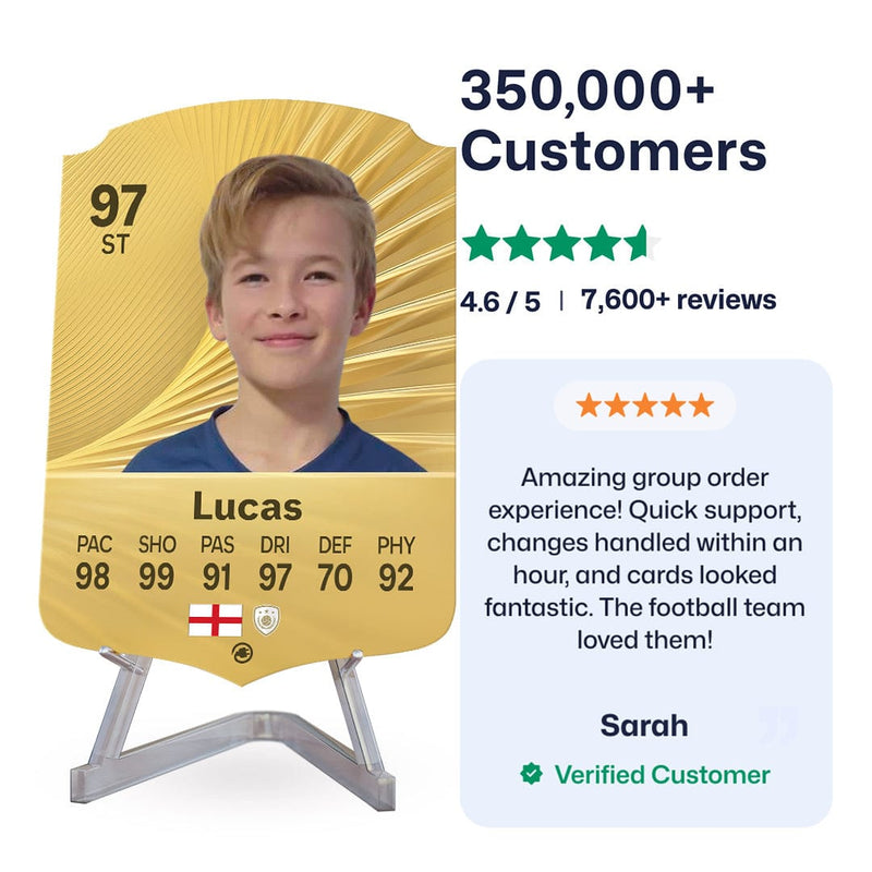 Yes! Our football card designers will remove the background from the photo you upload so it looks just like the football cards you might’ve seen games like EA FC 25, EA FC 24 or FIFA. We’ll also position the photo perfectly on the football card so it looks great. If there are any problems with the quality of your photo, we’ll reach out and let you know. Plus, our website's AI will remove the background on the image for visual purposes before purchase so you can see it without a background on the card.