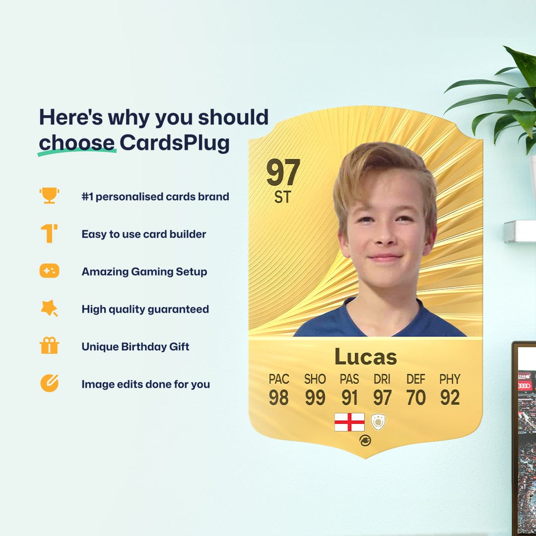CardsPlug is home to the world’s favourite personalised football cards. Our easy football card builder lets you make a real life football card with your own name, photo, and skill ratings. With 100+ designs to choose from and some inspired by EA SPORTS FC 26 cards seen in EA FC 26, EA FC 25 and FC 24 as well as FIFA cards seen in games like FIFA 23 and FIFA 22.