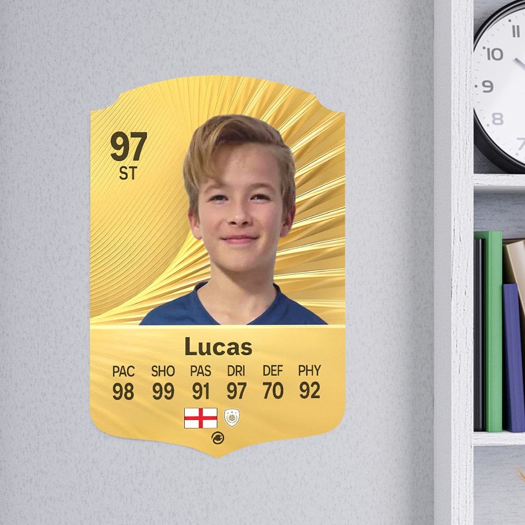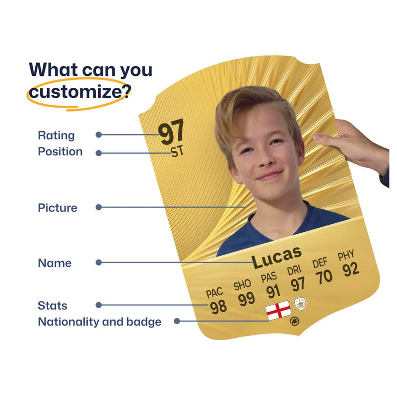 When it comes to personalising your card, the basic steps are to upload a photo and add a name to your card. Then you’ll add details like your player’s position and skill ratings out of 99 for each football skill shown on the card. Our online card builder makes this really easy. And if you aren’t a football card expert, don’t worry!