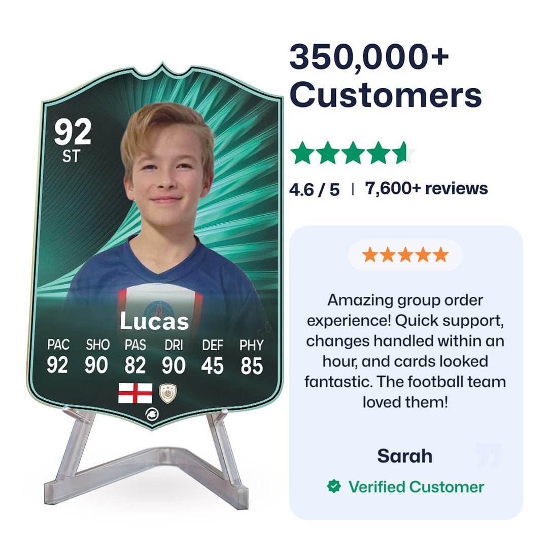 Yes! Our football card designers will remove the background from the photo you upload so it looks just like the football cards you might’ve seen games like EA FC 25, EA FC 24 or FIFA. We’ll also position the photo perfectly on the football card so it looks great. If there are any problems with the quality of your photo, we’ll reach out and let you know. Plus, our website's AI will remove the background on the image for visual purposes before purchase so you can see it without a background on the card.
