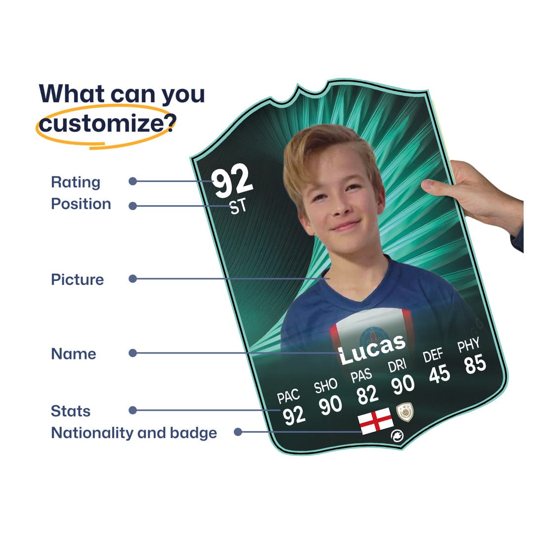 When it comes to personalising your card, the basic steps are to upload a photo and add a name to your card. Then you’ll add details like your player’s position and skill ratings out of 99 for each football skill shown on the card. Our online card builder makes this really easy. And if you aren’t a football card expert, don’t worry!