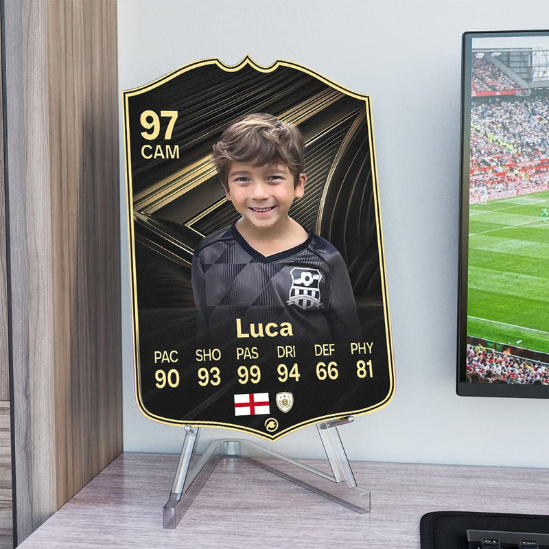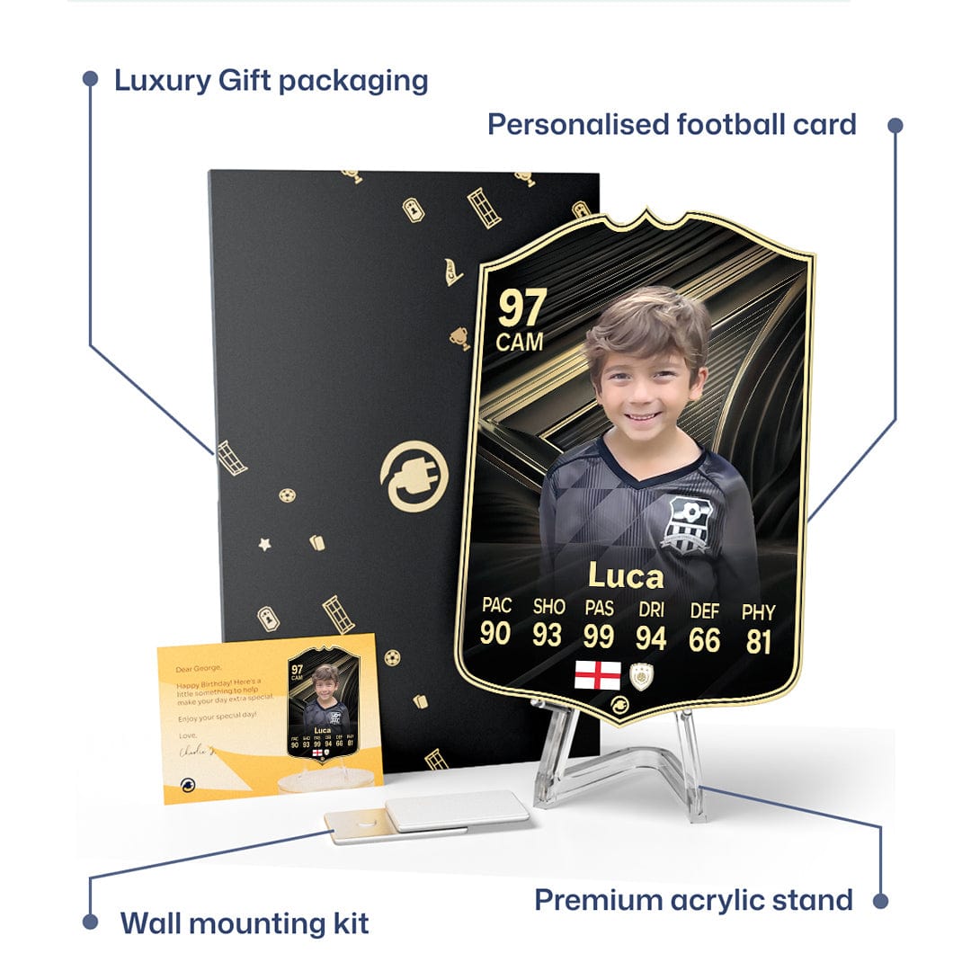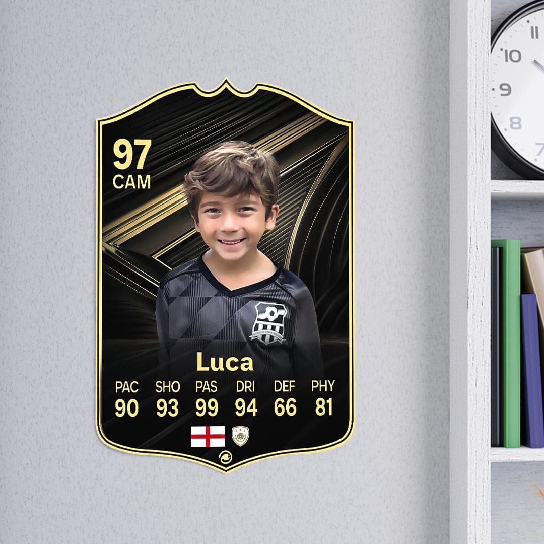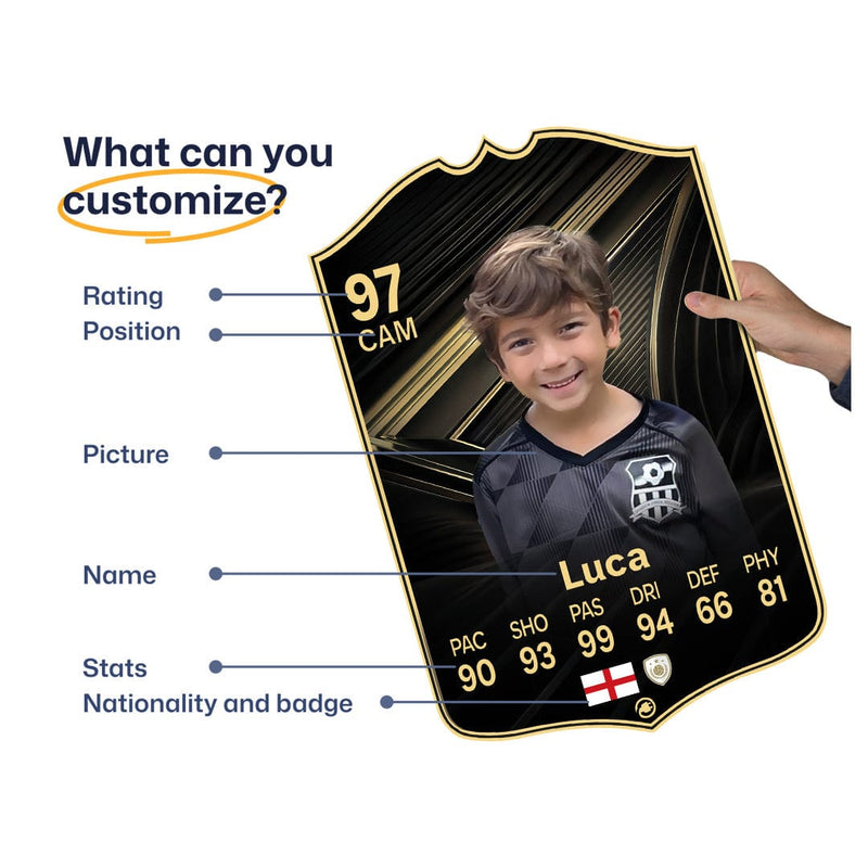 When it comes to personalising your card, the basic steps are to upload a photo and add a name to your card. Then you’ll add details like your player’s position and skill ratings out of 99 for each football skill shown on the card. Our online card builder makes this really easy. And if you aren’t a football card expert, don’t worry!