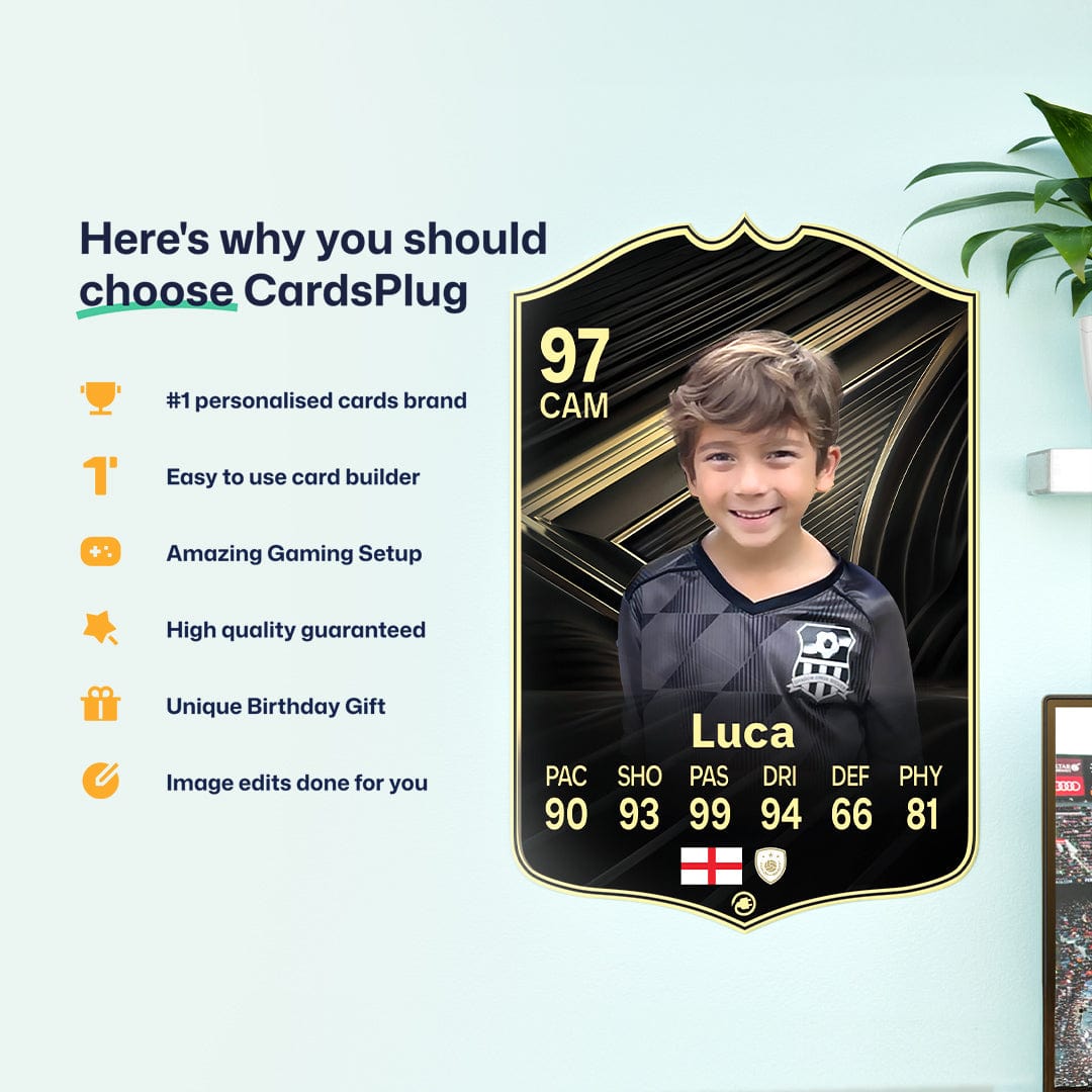 CardsPlug is home to the world’s favourite personalised football cards. Our easy football card builder lets you make a real life football card with your own name, photo, and skill ratings. With 100+ designs to choose from and some inspired by EA SPORTS FC 26 cards seen in EA FC 26, EA FC 25 and FC 24 as well as FIFA cards seen in games like FIFA 23 and FIFA 22.