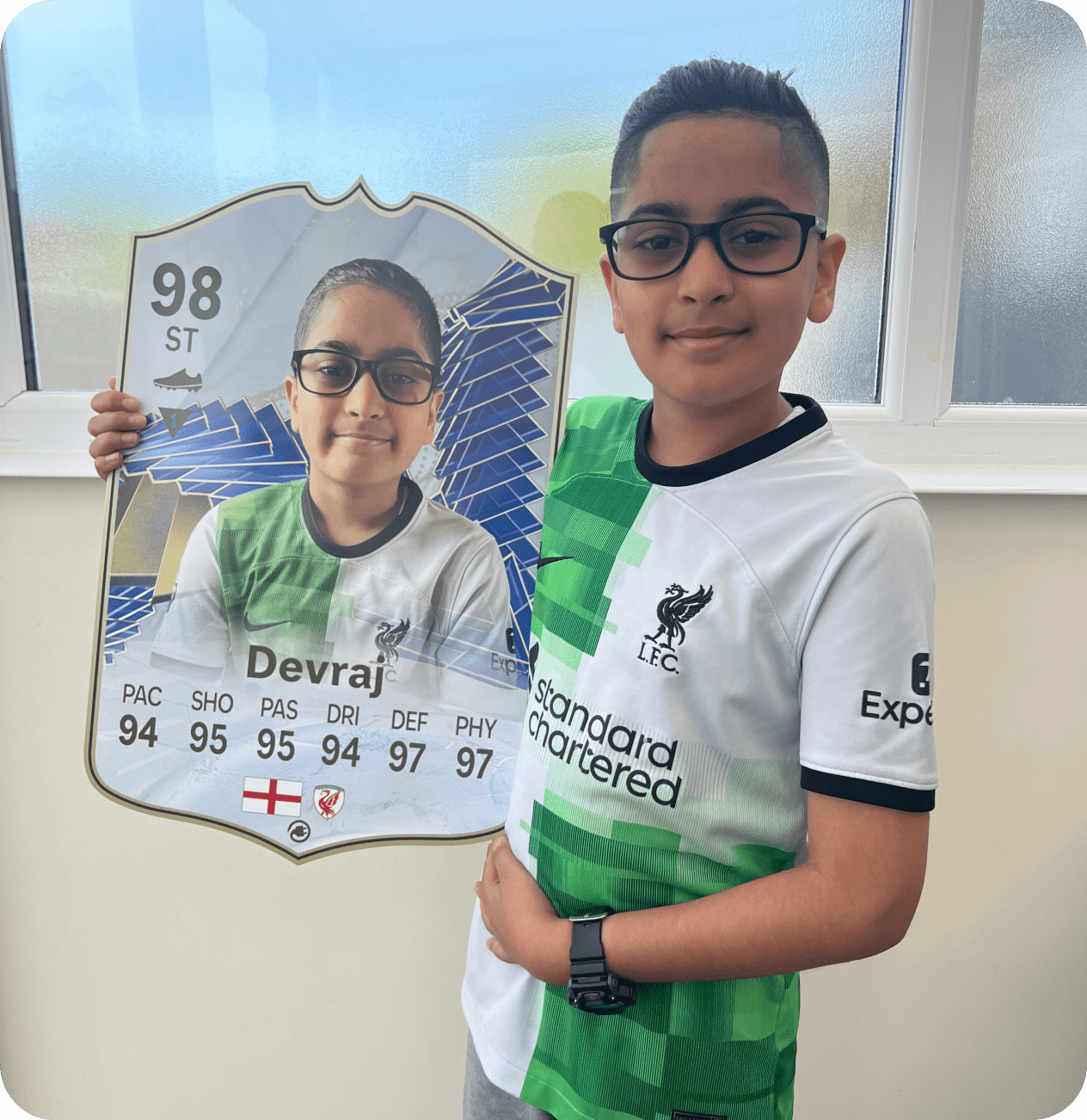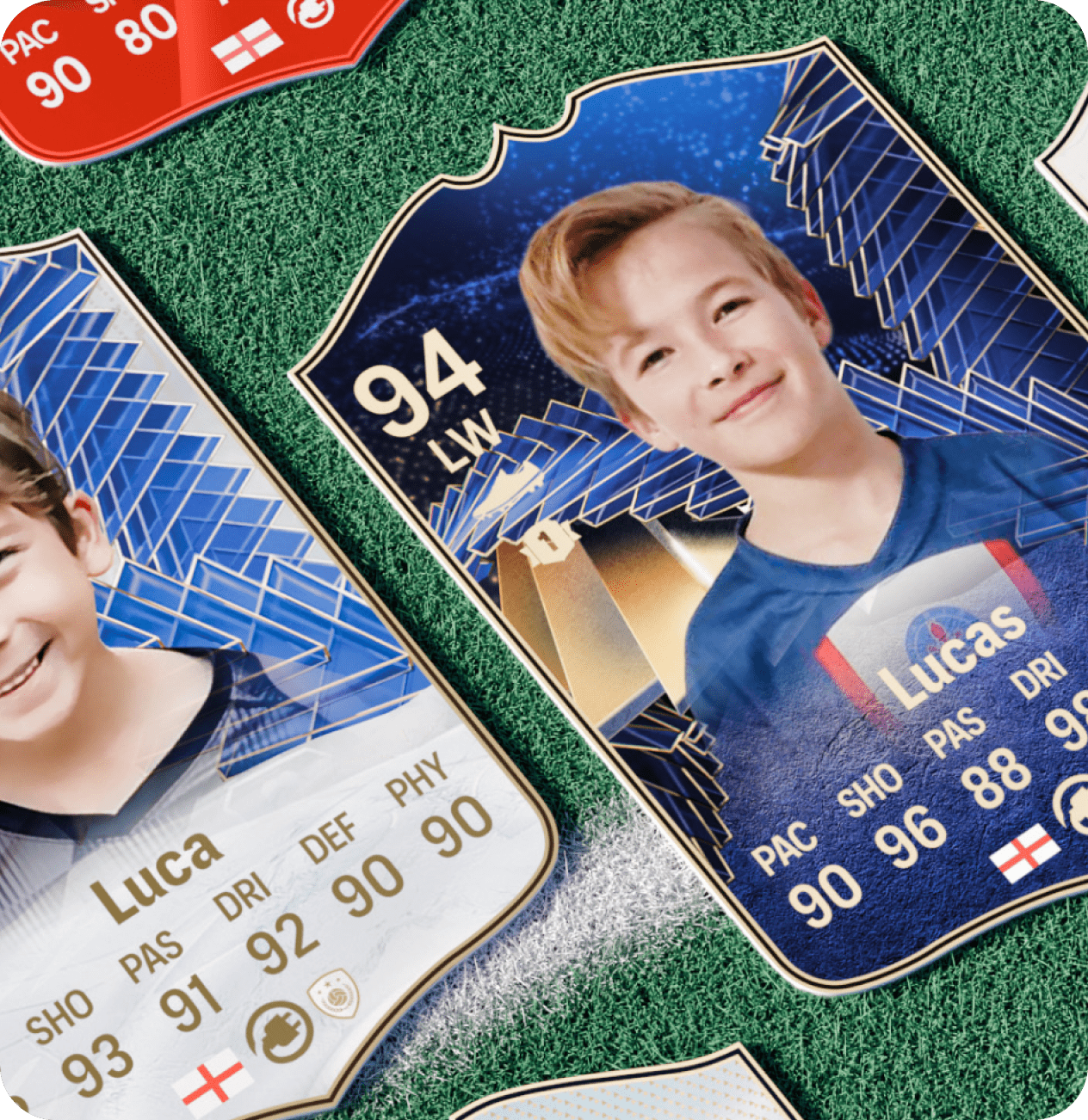 When it comes to personalising your card, the basic steps are to upload a photo and add a name to your card. Then you’ll add details like your player’s position and skill ratings out of 99 for each football skill shown on the card. Our online card builder makes this really easy. And if you aren’t a football card expert, don’t worry!