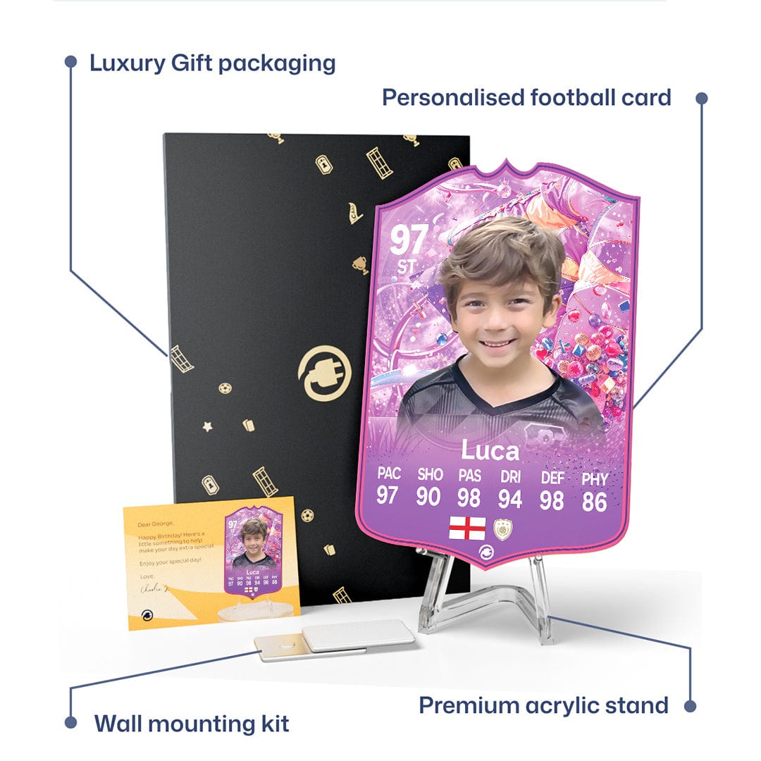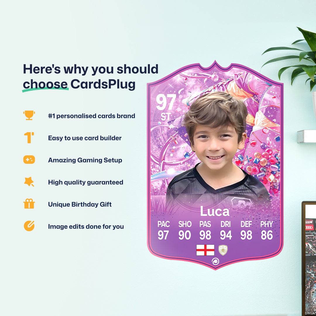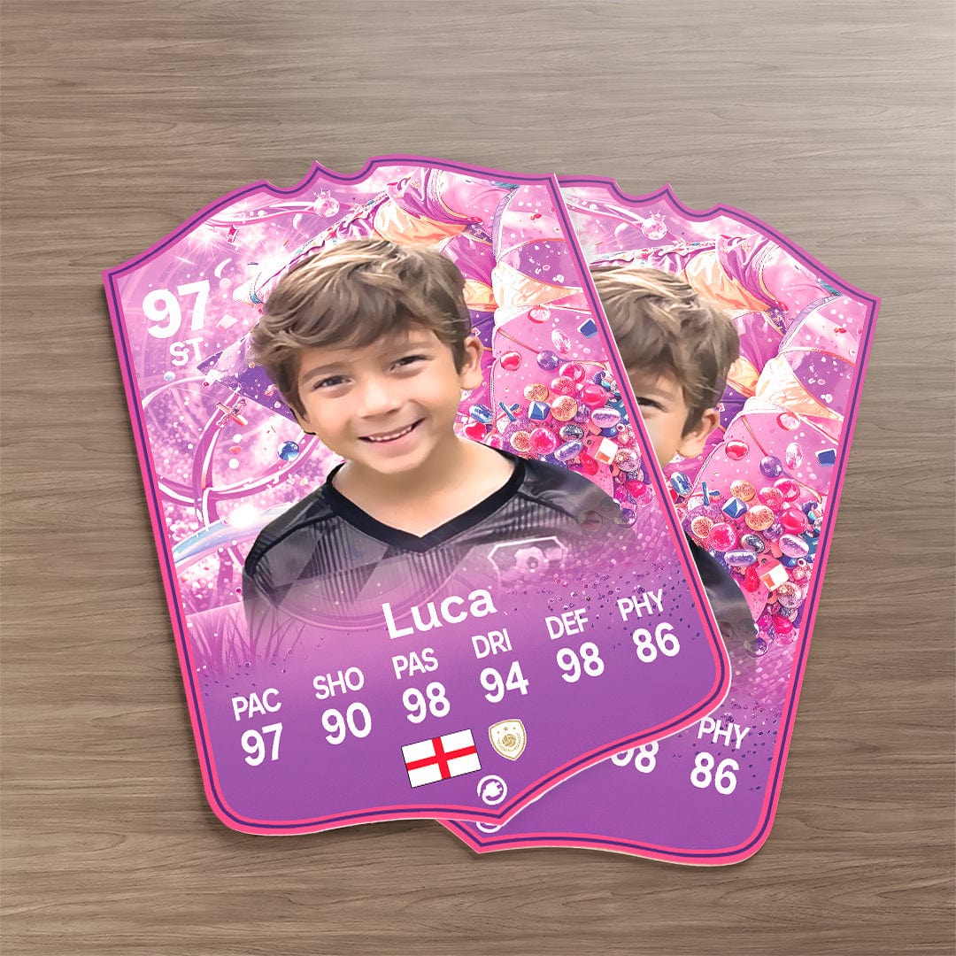 CardsPlug is home to the world’s favourite personalised football cards. Our easy football card builder lets you make a real life football card with your own name, photo, and skill ratings. With 100+ designs to choose from and some inspired by EA SPORTS FC 26 cards seen in EA FC 26, EA FC 25 and FC 24 as well as FIFA cards seen in games like FIFA 23 and FIFA 22.