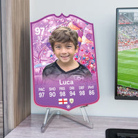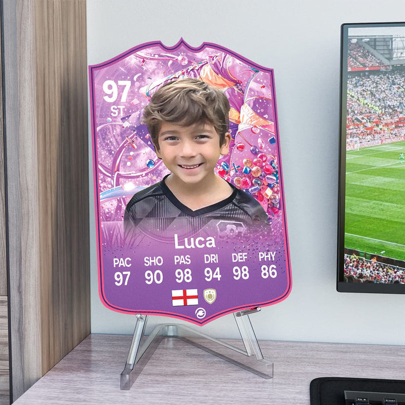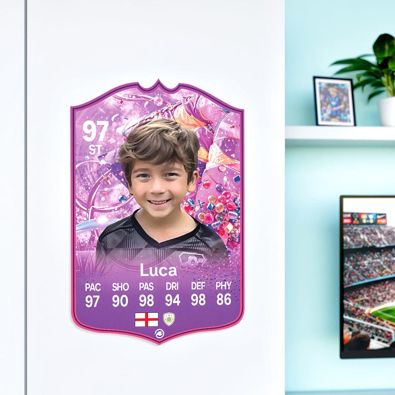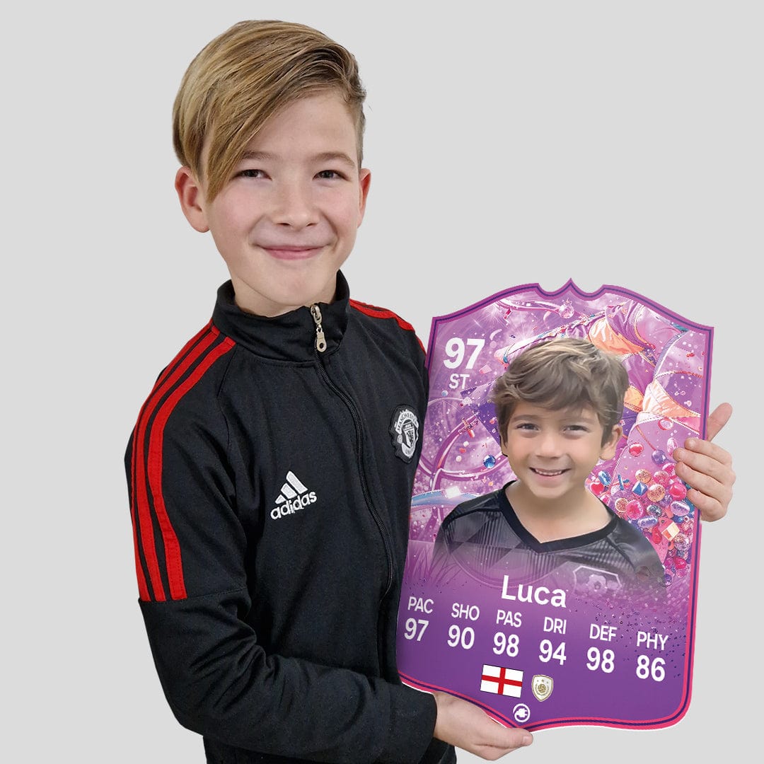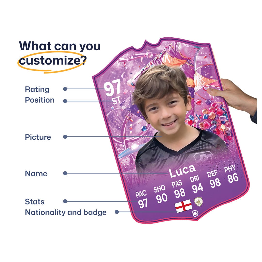 When it comes to personalising your card, the basic steps are to upload a photo and add a name to your card. Then you’ll add details like your player’s position and skill ratings out of 99 for each football skill shown on the card. Our online card builder makes this really easy. And if you aren’t a football card expert, don’t worry!
