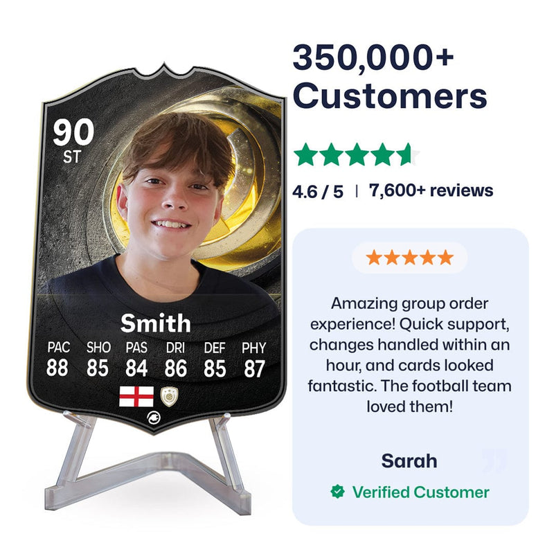 Yes! Our football card designers will remove the background from the photo you upload so it looks just like the football cards you might’ve seen games like EA FC 25, EA FC 24 or FIFA. We’ll also position the photo perfectly on the football card so it looks great. If there are any problems with the quality of your photo, we’ll reach out and let you know. Plus, our website's AI will remove the background on the image for visual purposes before purchase so you can see it without a background on the card.
