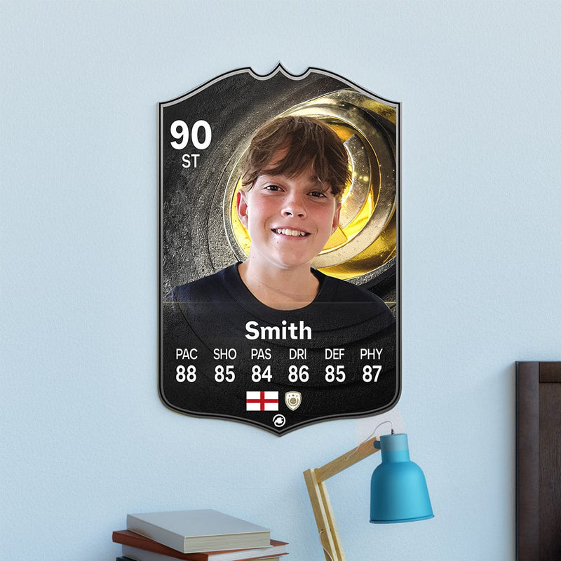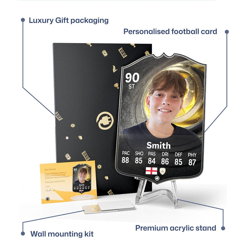 When it comes to personalising your card, the basic steps are to upload a photo and add a name to your card. Then you’ll add details like your player’s position and skill ratings out of 99 for each football skill shown on the card. Our online card builder makes this really easy. And if you aren’t a football card expert, don’t worry!