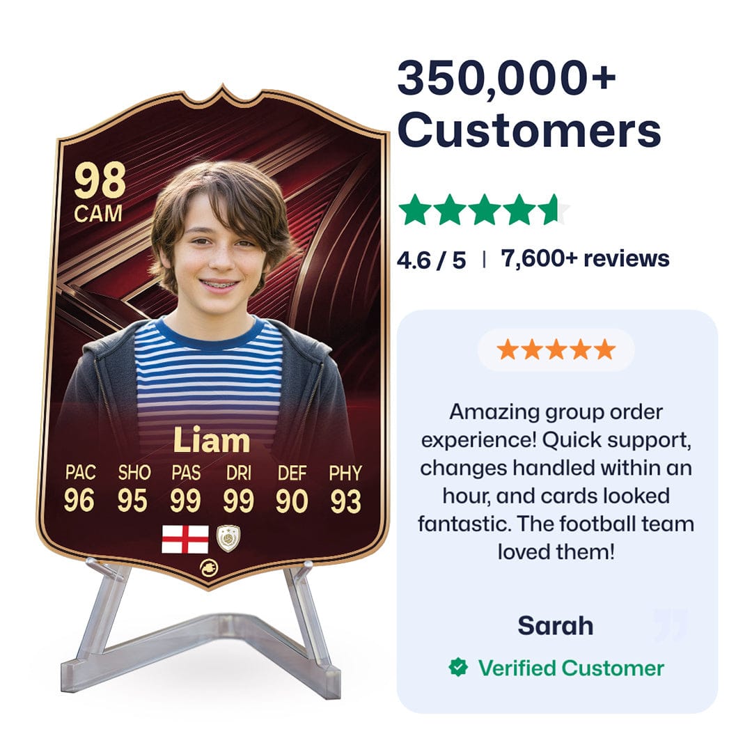 Once you’ve personalised your card, our design experts will edit your photo, design your card, and bring it to life in stunning quality. You’ll get a full preview before we print your card and every card’s quality is backed by our Gold Standard Guarantee. So far, over 350,000+ football fans agree: A CardsPlug football card is the ultimate football gift!