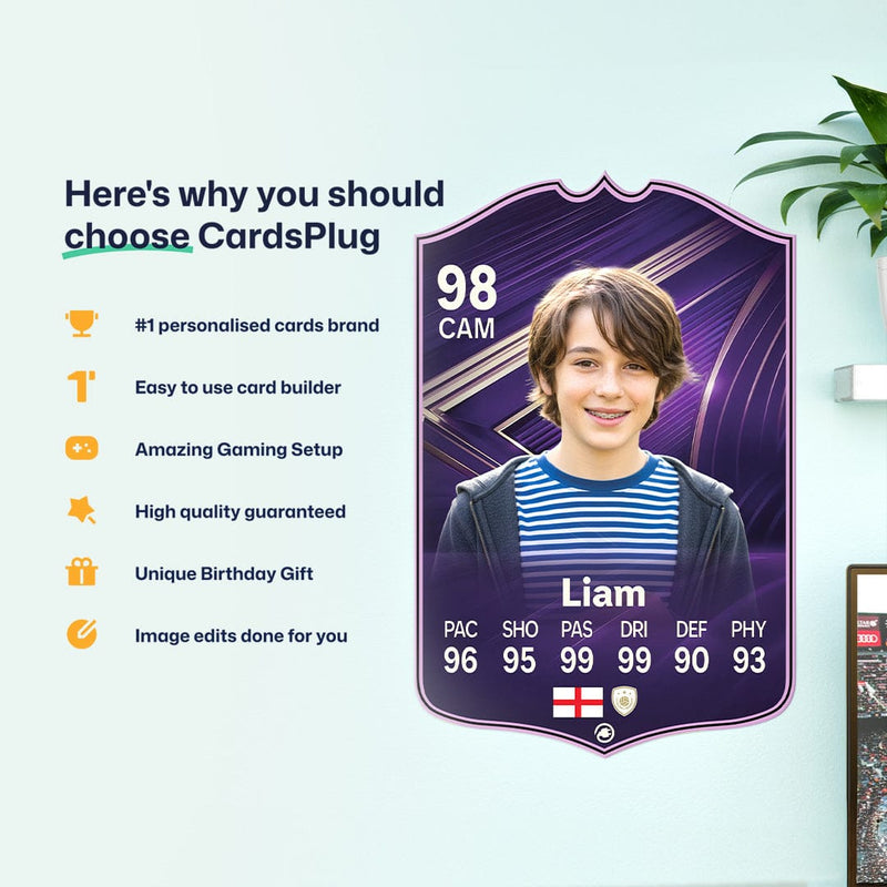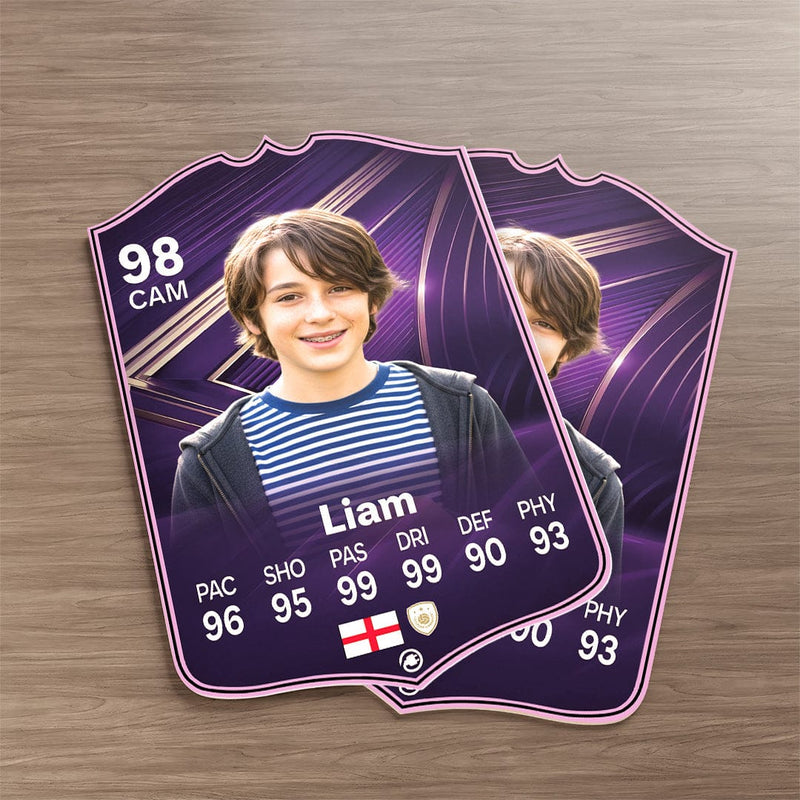 CardsPlug is home to the world’s favourite personalised football cards. Our easy football card builder lets you make a real life football card with your own name, photo, and skill ratings. With 100+ designs to choose from and some inspired by EA SPORTS FC 26 cards seen in EA FC 26, EA FC 25 and FC 24 as well as FIFA cards seen in games like FIFA 23 and FIFA 22.