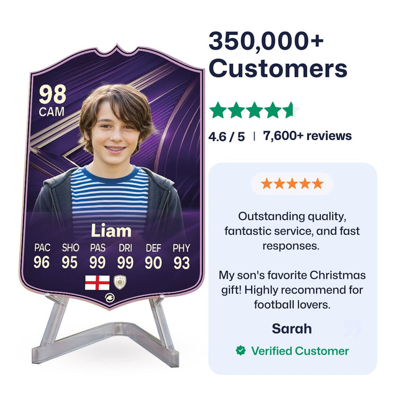 Once you’ve personalised your card, our design experts will edit your photo, design your card, and bring it to life in stunning quality. You’ll get a full preview before we print your card and every card’s quality is backed by our Gold Standard Guarantee. So far, over 350,000+ football fans agree: A CardsPlug football card is the ultimate football gift!