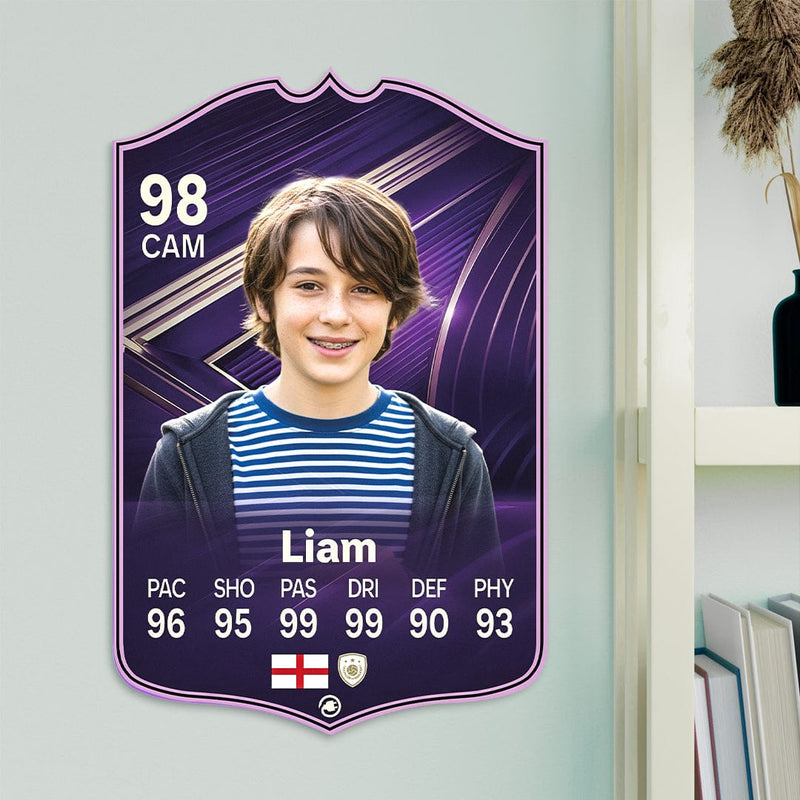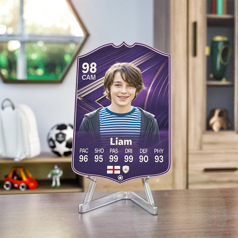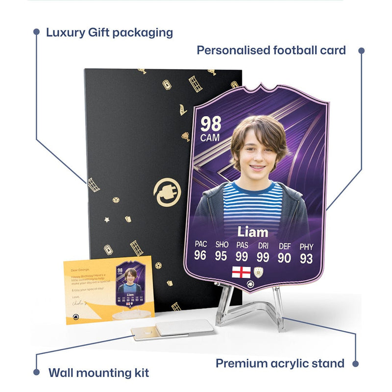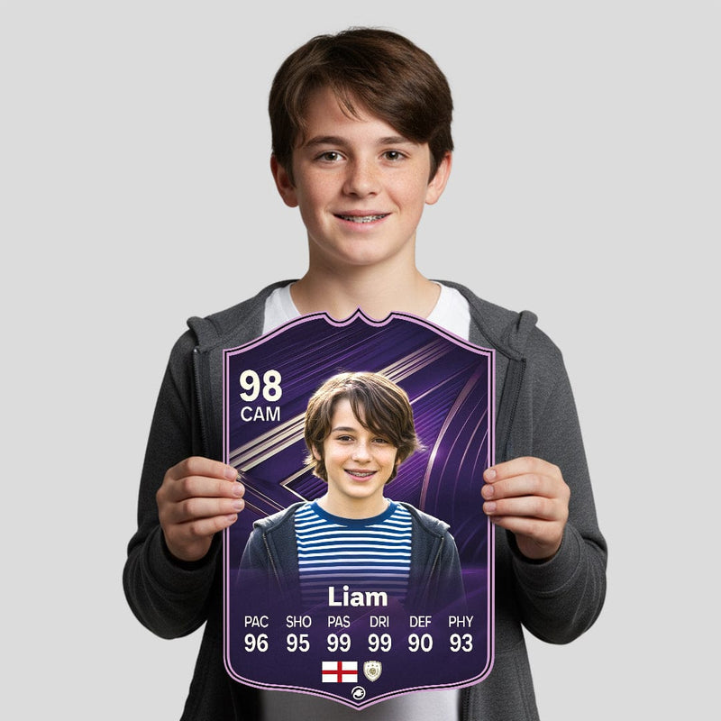 When it comes to personalising your card, the basic steps are to upload a photo and add a name to your card. Then you’ll add details like your player’s position and skill ratings out of 99 for each football skill shown on the card. Our online card builder makes this really easy. And if you aren’t a football card expert, don’t worry!