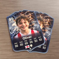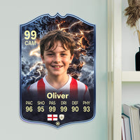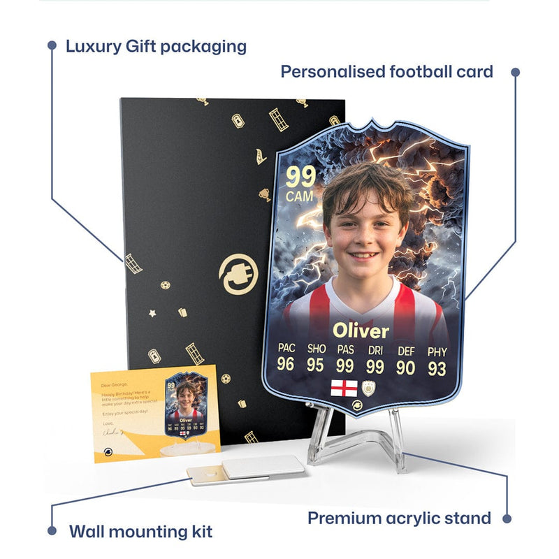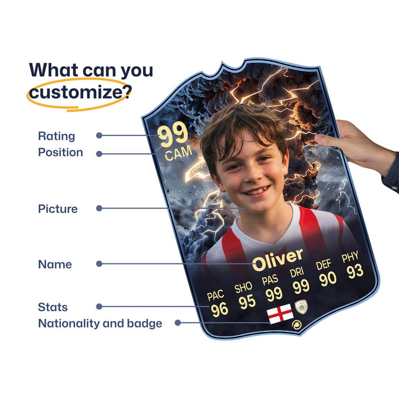 When it comes to personalising your card, the basic steps are to upload a photo and add a name to your card. Then you’ll add details like your player’s position and skill ratings out of 99 for each football skill shown on the card. Our online card builder makes this really easy. And if you aren’t a football card expert, don’t worry!