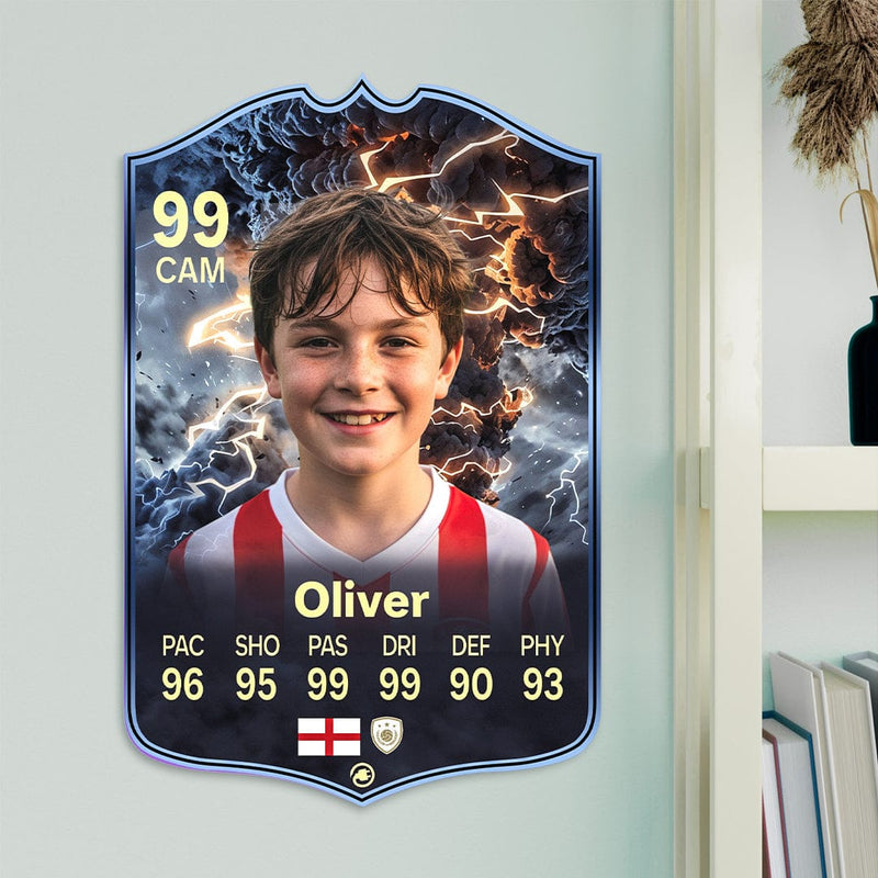 Our football card builder lets you choose between two different card materials. Our Standard cards are made of a ultra-strong variety of Foamex (not cardboard or foam!). This material has a lovely gloss finish and is also super durable. Our world-exclusive Metal football cards have a matte finish and are slightly heavier. Both look amazing and will last forever.