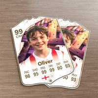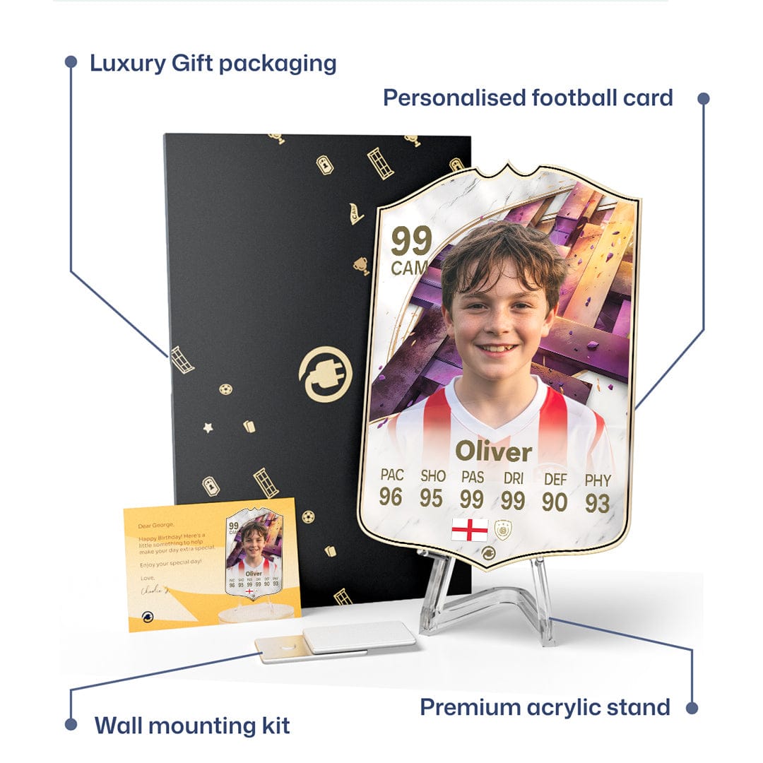 When it comes to personalising your card, the basic steps are to upload a photo and add a name to your card. Then you’ll add details like your player’s position and skill ratings out of 99 for each football skill shown on the card. Our online card builder makes this really easy. And if you aren’t a football card expert, don’t worry!