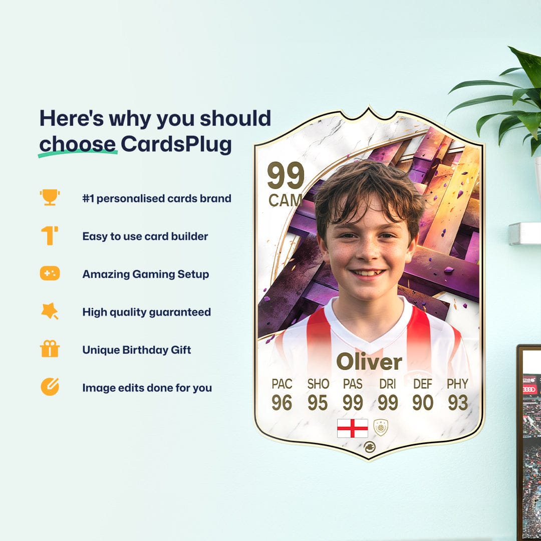 CardsPlug is home to the world’s favourite personalised football cards. Our easy football card builder lets you make a real life football card with your own name, photo, and skill ratings. With 100+ designs to choose from and some inspired by EA SPORTS FC 26 cards seen in EA FC 26, EA FC 25 and FC 24 as well as FIFA cards seen in games like FIFA 23 and FIFA 22.